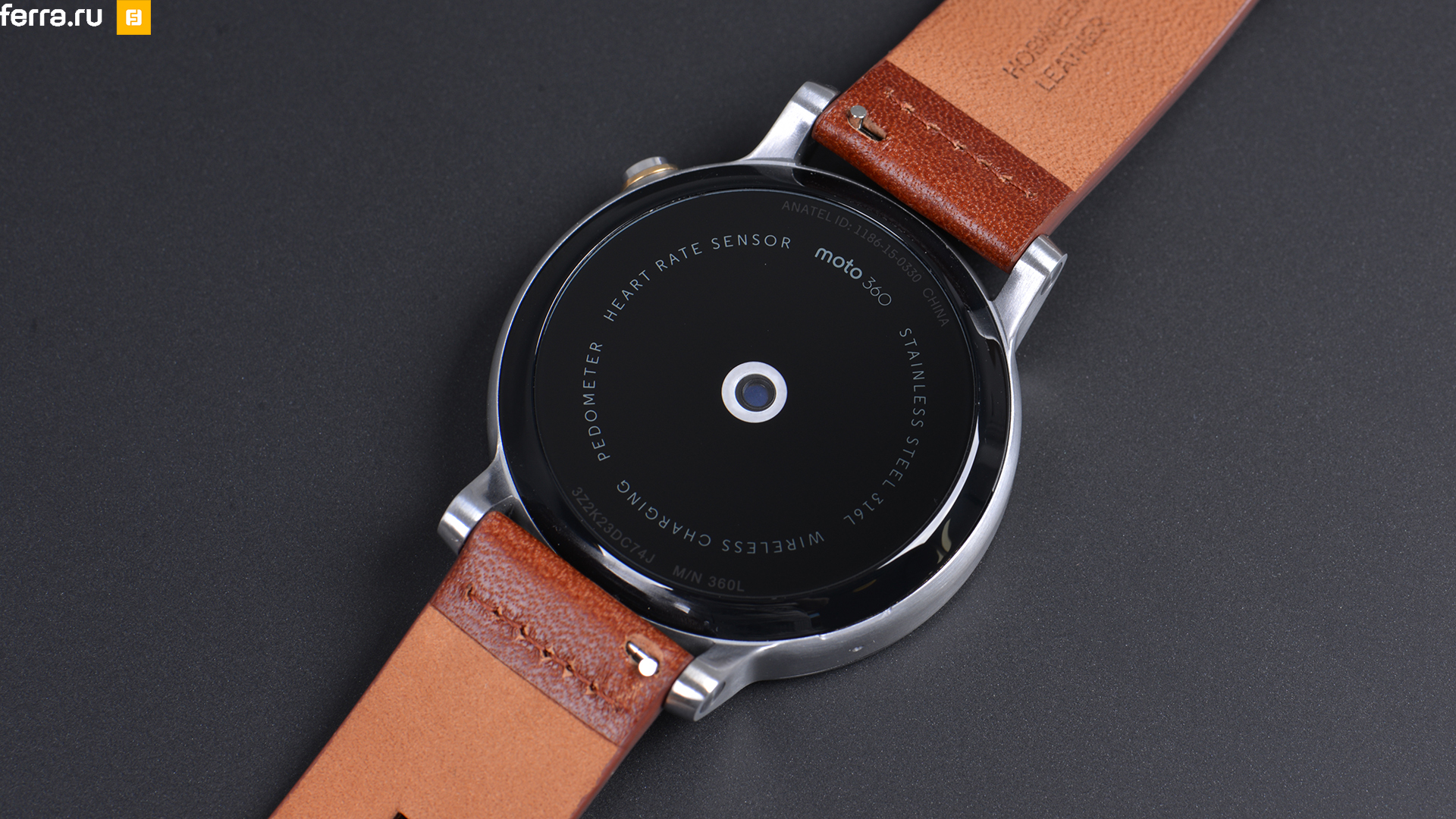 Материал корпуса Moto 360 — нержавеющая сталь, материал коричневого ремешка — кожа. По крайней мере, так заявляет производитель. Толщина устройства составляет 11,4 мм. Она немного замаскирована благодаря тому, что нижняя часть часов имеет чёрный цвет и скошена по краям.