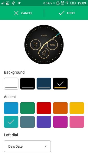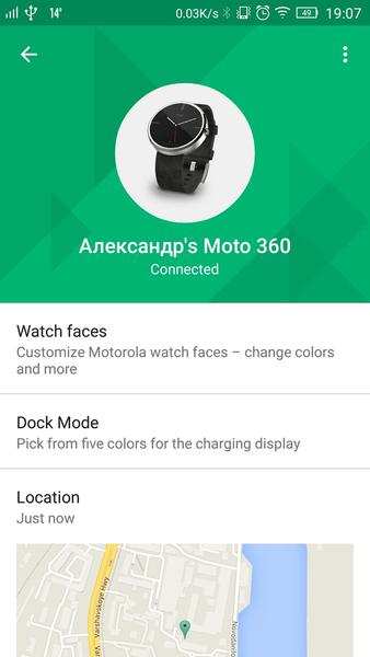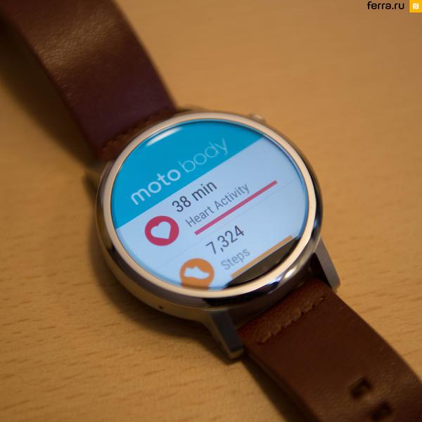 Ничего радикального нового в плане софта от Moto 360 v2 ждать не приходится, ведь перед нами уже известная ОС Android Wear. После сопряжения со смартфоном по Bluetooth, часы подхватывают через него все мини-версии приложений, и можно начинать ими пользоваться. Кстати, Moto 360 могут подключаться через Wi-Fi и уже по общей со смартфоном сети получать от него уведомления. При подключении часов к смартфону вам тут же предлагается скачать на него приложение Android Wear, через которое можно менять циферблат часов (так называемый Watch Face), делать скриншот с носимого устройства (получается он почему-то квадратным), а также получить совет, какие еще приложение можно установить. Одно из таких — Moto Body. По сути, это типичное фитнес-приложение, которое собирает информацию с датчиков и рисует вам красивую инфографику. В случае с Moto 360 вы можете следить за количеством пройденных шагов, предположительно сожжённых калорий и минут сердечной активности. Я не очень уверен, что последний пункт как-то повязан на пульсометре. Судя по всему, частоту пульса можно узнать только по ручному запуску, никакой статистики по этому показателю я не смог найти ни в Moto Body для телефона, ни в аналогичном приложении на самих часах. Отчасти это может и правильно: заниматься спортом в таких часах я бы не стал (да и классические обычно в спорзал не одеваю), спать с ними — тем более (всё-таки очень массивные). Поэтому функции отслеживания ритма в течение тренировки или суток вряд ли были бы востребованы. Однако за 25 тысяч невольно ожидаешь функциональность пошире.