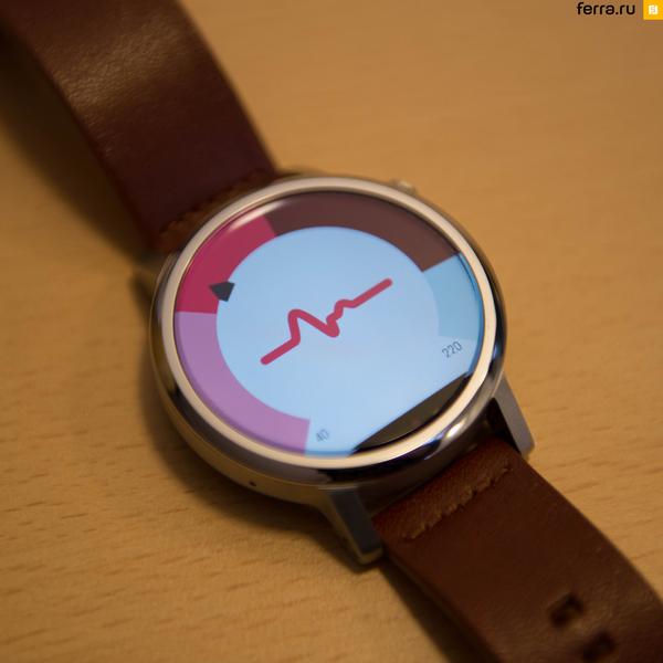 Основные параметра дисплея я уже упоминал. На мой взгляд, для 1,56-дюймового дисплея разрешение 360x330 пикселей несколько маловато, да и в целом качество изображение я бы назвал средним. Видно, что матрица могла бы быть и получше, а картинка посочнее. Это, возможно, и не бросается в глаза, но учитывая ценник в 25 тысяч рублей, хочется, чтобы ничего не оставляло ощущения компромиссности. Дисплей, кстати, снова не полностью круглый — внизу осталась чёрная полоса. Учитывая, что конкуренты спокойно выпускают круглые дисплеи, начинаешь думать, что это просто фирменная черта дизайна Moto 360, а не какая-то непреодолимая проблема для инженеров «моторолы».