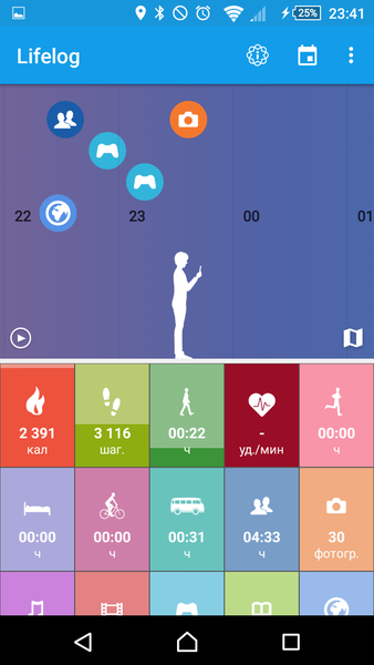 Приложение Lifelog показывает, как много времени вы уделяете социальным сетям, сколько сделали фотографий, слушали ли музыку и смотрите ли фильмы. Учтёт оно игры, книги и время в браузере. В общем, это полноценное приложение для мониторинга жизни с телефоном. Трекер лишь дополняет его информацией о сне и спорте, а также о том, какой пульс у вас был в тот или иной момент.
