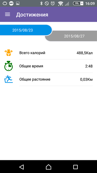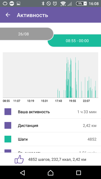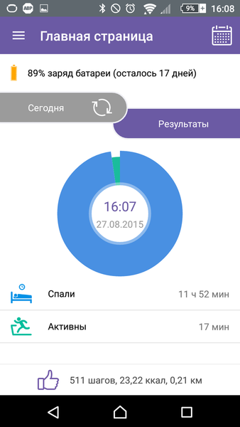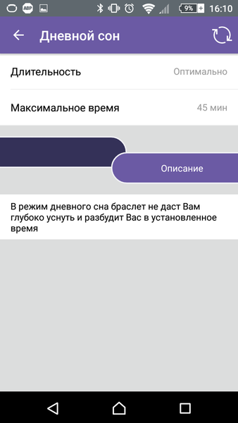 Сама программа довольно простая, но информации в ней предостаточно. Как мы уже сказали, браслет работает в четырёх режимах, которые переключаются вручную с помощью единственной кнопки. Есть режим тренировки, обычный, дневной и ночной сон. В каждом из них действуют свои настройки уведомлений и записи данных, а определить, какой именно режим включён помогают световые индикаторы в форме солнца и полумесяца. В активном режиме браслет просто мониторит количество шагов, дистанцию и калории. В тренировочном фиксирует время тренировки и её интенсивность. Во время сна браслет определяет время и фазы сна, а впоследствие может разбудить вас вибрацией. Режим дневного сна работает аналогично, с той лишь разницей, что вы устанавливаете не время пробуждения, а таймер, в течение скольких минут вам разрешается подремать. К сожалению, браслет не умеет сам переключать режимы, да и потом в приложении нельзя указать, чем именно вы занимались. Так что, если забыли вовремя нажать кнопку, будьте готовы к тому, что по мнению программы вы проспали весь день или наоборот, тренировались всю ночь