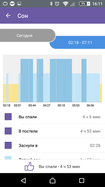 Данные в программе выводятся весьма подробно. Видно, когда бодрствуешь, когда лёгкий сон, когда глубокий. Есть наглядные графики, хоть и примитивно оформленные, но понятные. В целом, представление информации тут неплохое, но есть куда стремиться.