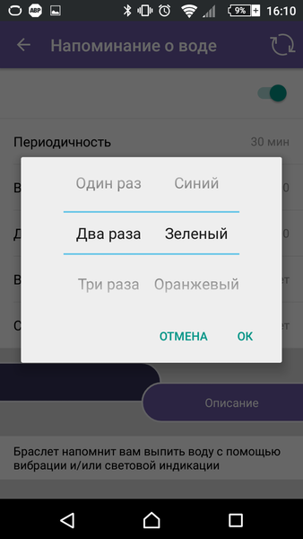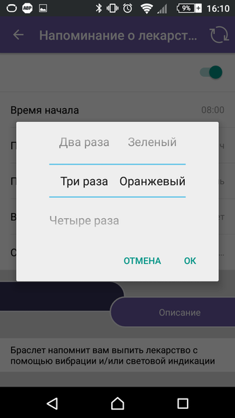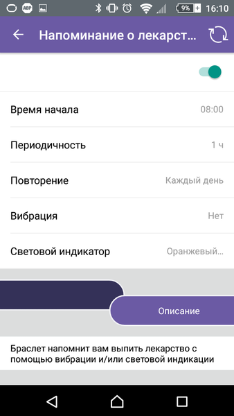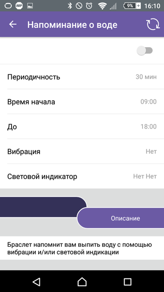 В настройках приложения есть множество различных вариантов установить напоминание с помощью браслета. Гаджет рассчитан на людей, которым не чужд спорт, так что тут есть напоминания о приёме воды и лекарств. Впрочем, они ничем особо не отличаются. Браслет всё равно сможет только провибрировать и помигать индикаторами. Зато тут настраивается, сколько раз и какой цвет должен мигать, так что один раз надо будет установить это, а потом просто выучить, что вибрация и три оранжевых сигнала это, к примеру, напоминание попить водички.