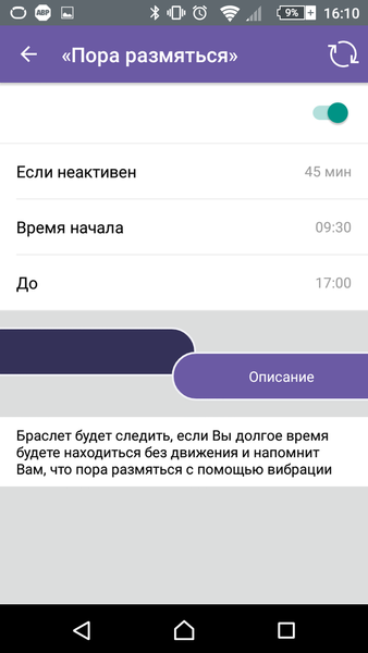 Есть тут и функция, которая напоминает, что вы засиделись и пора размяться, промежуток времени, через который браслету разрешено вам сообщать об этом, устанавливаете сами. А ещё трекер может вибрировать при входящем звонке, но у меня эта функция не работала, что логично, ведь браслет не подключён постоянно к смартфону. Кроме того, пару раз не сработал будильник и напоминание размяться, но судя по информации в программе, это исправили в новой версии прошивки, на которую мы, к сожалению, не смогли обновиться. Надеемся, что остальные неполадки тоже поправят.
