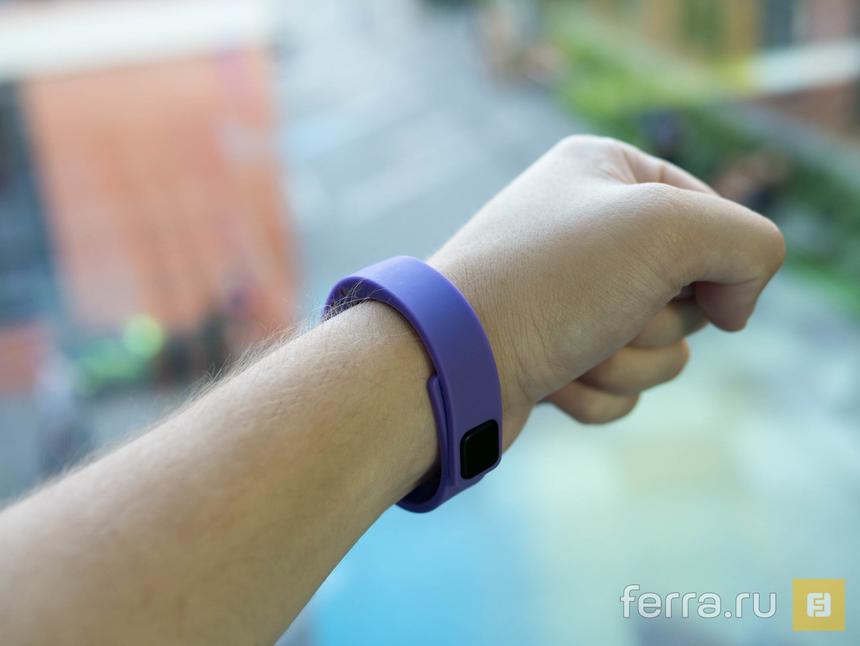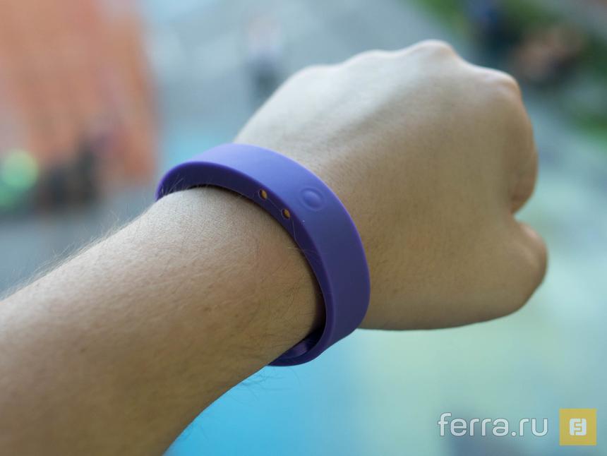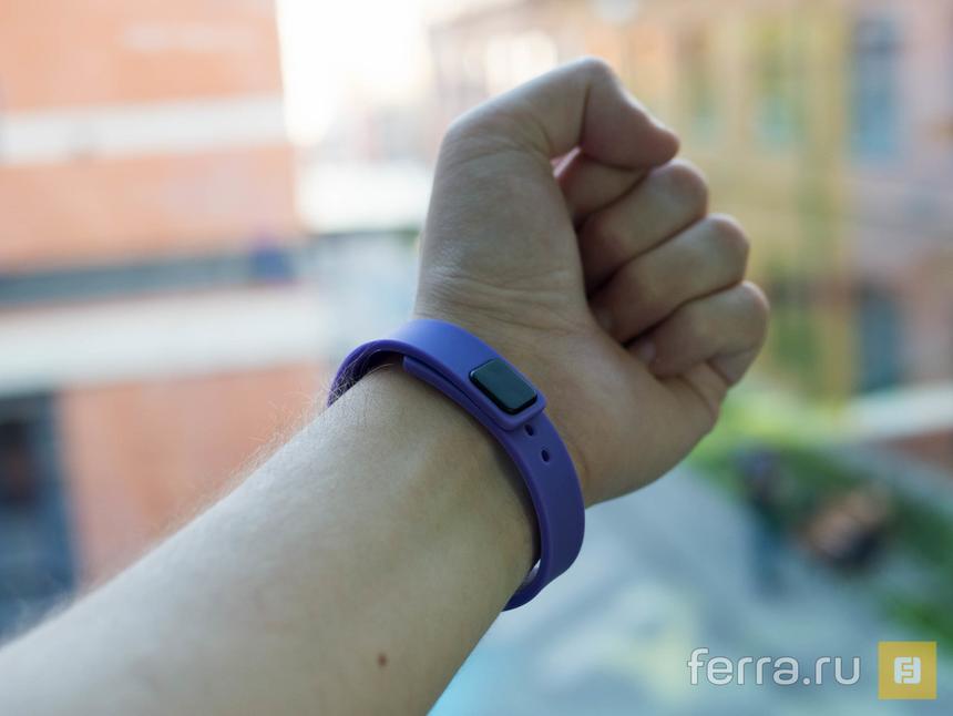Всего существует пять цветовых вариантов браслета: чёрный, голубой, зелёный, белый и фиолетовый. Самый непрактичный, конечно, белый, так как на нём будет видна любая грязь, а на чёрном пыль. Цвета у браслетов не вызывающе яркие, так что смотрится устройство на руке опрятно.