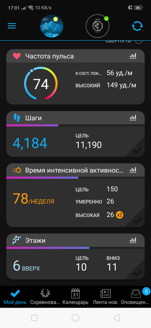 Несмотря на то, что куча информации доступна с самих часов, у них, само собой, навороченное приложение для смартфонов — Garmin Connect. Оно если не бесконечное, то уж очень «глубокое» — количество всяких меню, виджетов, подпунктов, графиков и прочего запредельное. Поэтому я расскажу о нём в общих чертах.