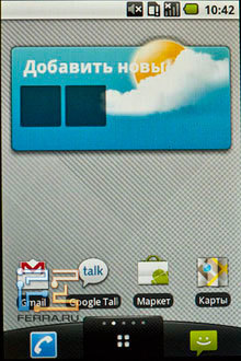 Лицевая сторона содержит пять элементов управления – три механические клавиши (call, end call и home), а также две сенсорные кнопки, отвечающие за вызов контекстного меню (левая) и за возврат (правая). Об экране мы поговорим отдельно, ну а пока стоит сказать, что он не имеет защитного покрытия (по аналогии с HTC Legend, iPhone 3GS, iPhone 4) и быстро покрывается отпечатками пальцев. К механическим повреждениям экран устойчив, но я бы не рекомендовал носить его в одном кармане с ключами и прочими потенциально опасными предметами.