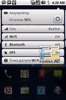 Изменена и область уведомлений, сюда Acer тоже добавила измерений. Привычным жестом из-под верхней кромки экрана вытягивается опять-таки фирменный блок управления беспроводными интерфейсами в компании с индикатором заряда. Сдвинув его в одну сторону, можно найти привычный список уведомлений, сдвинув в другую сторону — часы и кнопку для перехода к настройкам будильника.