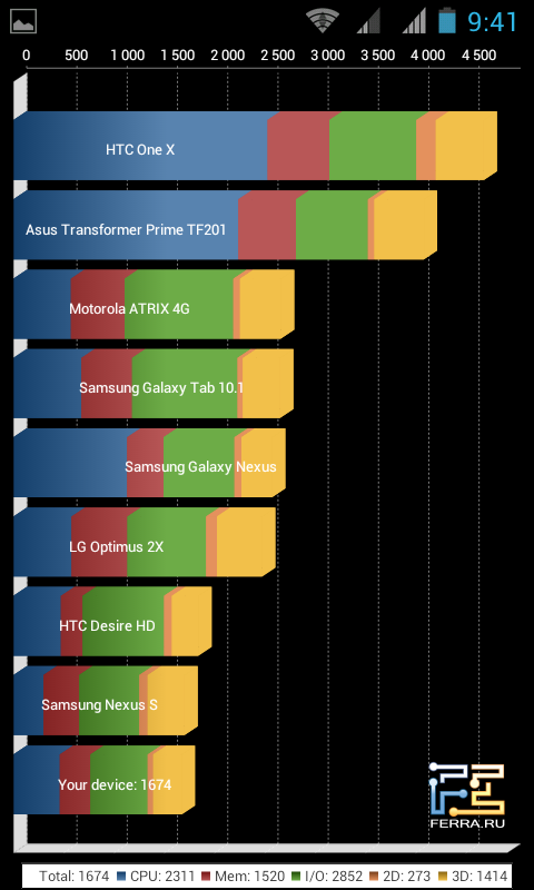 Процессор в OT 993D не из высшей лиги, но вполне современный — это одноядерный Qualcomm MSM7227A с частотой 1 ГГц, который используется, например, в Samsung Omnia M, LG Optimus L7 и HTC Desire V. А вот памяти маловато — всего 512 МБ, что мешает держать много запущенных приложений одновременно, но не сильно сказывается на отзывчивости. Подтормаживаний нет, есть лишь едва заметная задержка при перелистывании экранов. Результаты привычных тестов, на мой взгляд, не показательны, смартфон не так плох, как они рисуют, поверьте на слово.