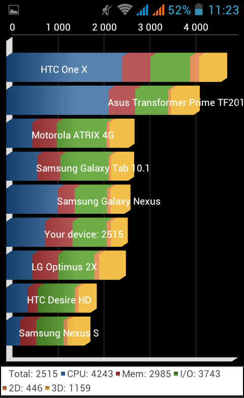 Производитель отдал предпочтение доступному решению тайваньской компании MTK. Чип MTK6577 хоть и включает в себя два ядра, особенной производительностью не обладает. Кроме того, у IQ450 всего 512 МБ оперативной памяти — скромно по нынешним меркам. Все это сказывается на отзывчивости аппарата: есть некоторая задумчивость при отрисовке главного меню, перелистывании рабочих столов и подобном. Откровенных тормозов нет, но наш пытливый взгляд все заметил. В дополнение к словам приведем стандартные тесты бенчмарков, они также показательны.