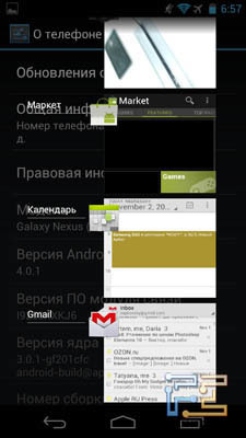 Концептуально Android 4.0 основана все же больше на планшетной версии операционной системы, нежели на смартфонной. На это указывает и блок из трех управляющих кнопок, интегрированных прямо в интерфейс ОС: «Назад», «Домой» и кнопка вызова последних запущенных программ. Реализация экрана блокировки напоминает таковую в оболочке HTC Sense — здесь тоже надо переместить кольцо, чтобы включить устройство. Отсюда же доступна камера и список уведомлений. Последний, к слову, стал еще удобнее благодаря доступу к настройкам и управлению плеером, а также возможности удалять отдельные сообщения простым жестом смахивания. Одно из самых эффектных нововведений — функция разблокировки с помощью распознавания лица владельца. Смартфон с помощью фронтальной камеры анализирует множество контрольных точек, и если они совпадают с данными хозяина, разблокирует аппарат.