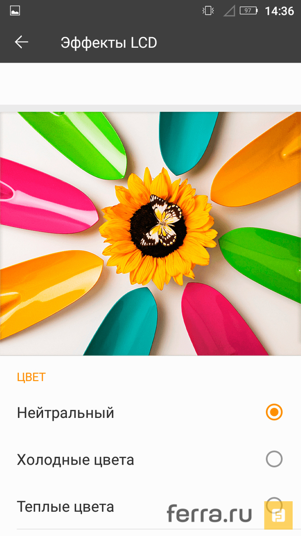 Для тех, кому не пришёлся во вкусу стандартный оттенок белого, в настройках предусмотрена регулировка цветовой температуры. Противники перенасыщенной цветопередачи в AMOLED-дисплеях могут уменьшить эффект активацией экономичной подсветки — заодно и время работы увеличится. А для зимнего периода можно включить опцию, чтобы дисплей реагировал на касание в перчатках.