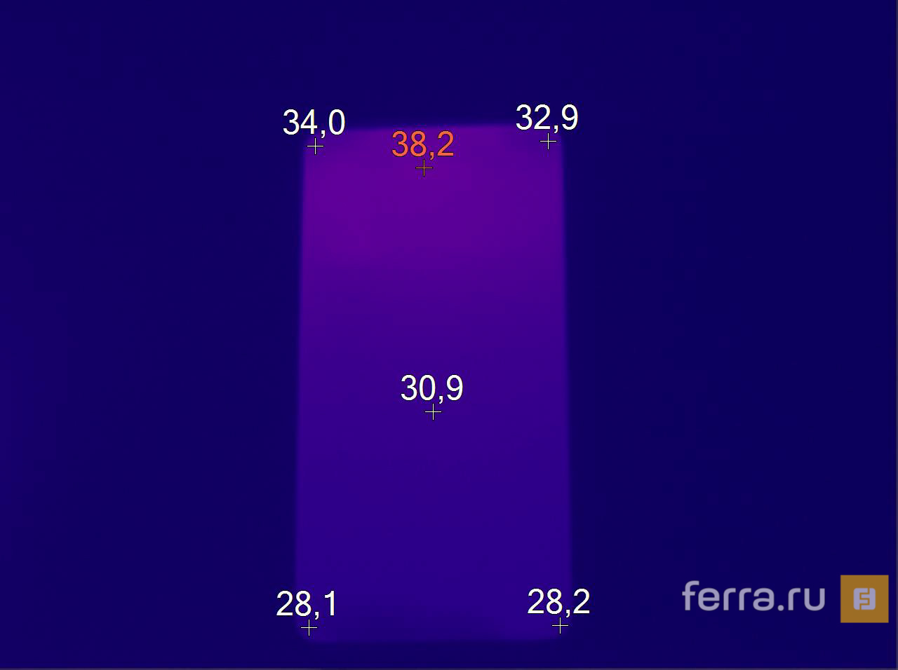 На снимках с тепловизора мы видим, что китайцам хватило ума не устанавливать  процессор под аккумулятор (вообще, можно и под него, но не тогда, когда речь идёт о полуподвальных фирмах-самоучках), и поэтому под высокой нагрузкой из всего корпуса разогревается лишь сегмент у тыловой камеры. По большому счёту, эта часть смартфона становится лишь чуть тёплой, тогда как подавляющая его площадь не нагревается ровным счётом никак. Играть на Power Five можно долго, без опаски и дискомфорта.