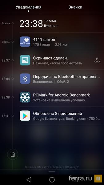 Новейший вариант оболочки EMUI, который гнездится на базе Android 6.0, со времён Lollipop изменился в мелочах, зато в лучшую сторону. Иконки чуть разгладились, приложения научились спрашивать разрешения, прежде чем хулиганить (доступ к файловой системе, местоположению, камере и т.д.), из диковинных для недорогих Huawei приложений можно отметить «Здоровье» (подсчёт шагов, калорий, вот этого всего), а из предустановленного добра в прошивке по-прежнему наличествует Яндекс, Новости и почта Mail.ru, Opera, Shazam, Booking.com, Dropbox и, внезапно, Сбербанк. Нельзя сказать, что приложения бесполезны, да и удалить их не составит труда, но в сумме партнёрского софта накапливается уж очень много.