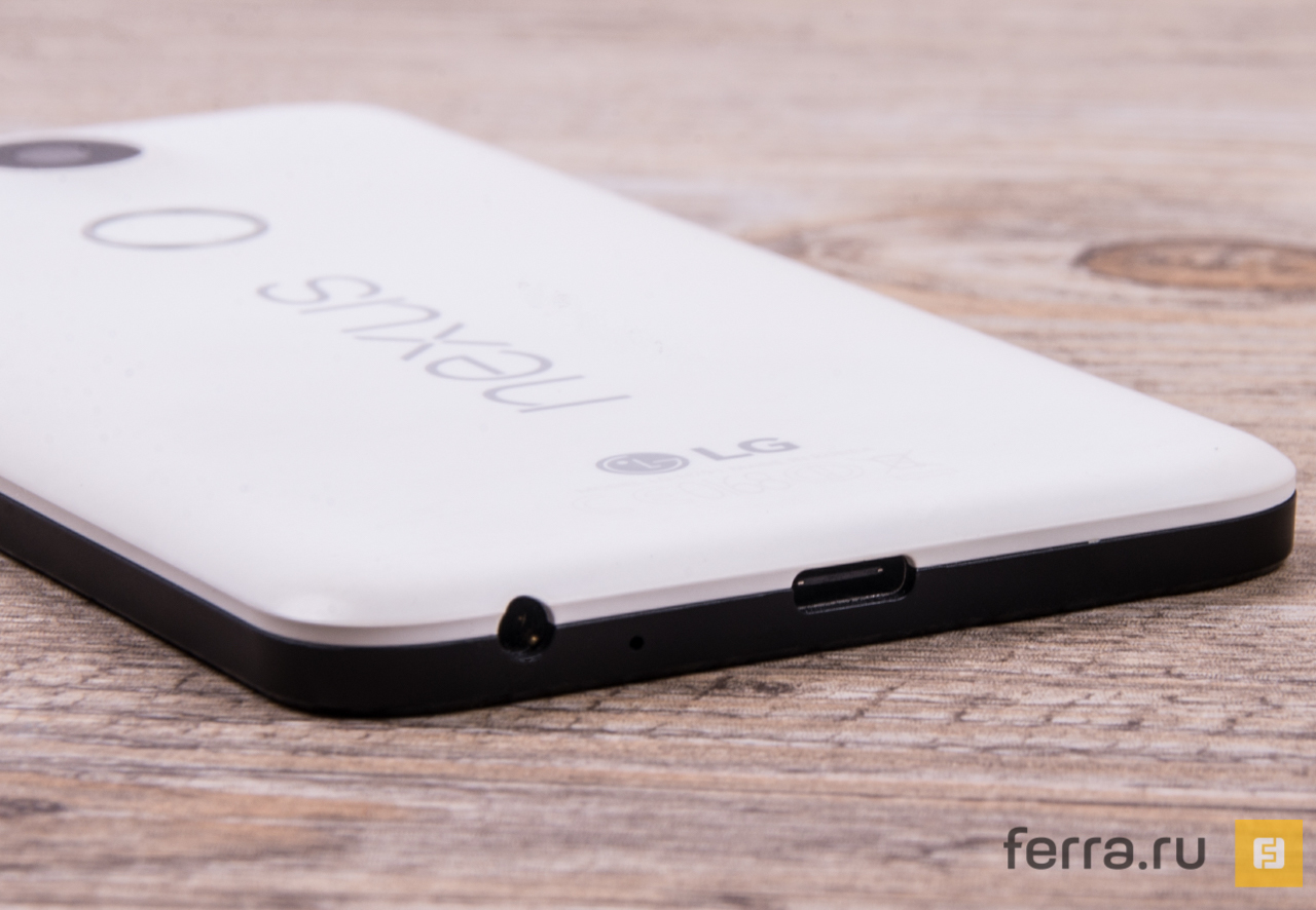 Правда, на этом приятные элементы дизайна заканчиваются и начинаются неприятные. Фронтальная панель смартфона по неведомой причине выполнена в старых недобрых традициях HTC: динамики, расположенные по обе стороны дисплея, на ровном месте прибавляют смартфону длины. И ведь это не залог крутого стереозвука, как в смартфонах HTC, а всего лишь набор из разговорного динамика и динамика громкой связи, в общем, как у всех. Поэтому в сравнении с Nexus 5 и его неполными 6 дюймами новинка выглядит не в меру разъевшимся фаблетом, и подросшая на 0,2 дюйма диагональ, а также хитро смонтированный в нижний динамик светодиод утешают слабо. В случае с Nexus 5X у такой компоновки только один плюс — экранные клавиши невозможно нажать случайно, как это часто случается с владельцами Galaxy S6 edge. И ещё — в комплекте со смартфоном поставляется лишь кабель с разъёмами USB-C по обе стороны, а это означает, что практически всем покупателям придётся раскошелиться на «народный» кабель USB-C - USB-A, который нынче обходится минимум в 500 рублей.