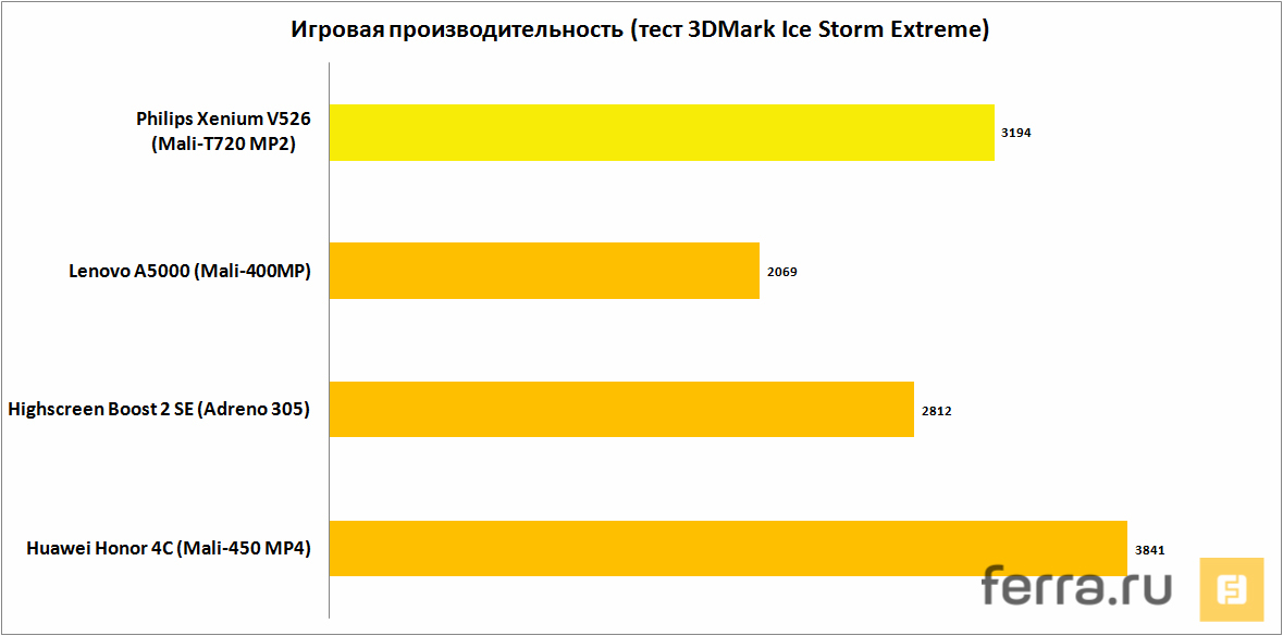 В довершение ко всему Xenium V526 оказался не в состоянии до конца пройти тест 3DMark Ice Storm Unlimited на прошивке 1545 V07A CIS с отключенным энергосбережением (процессор в это время ничего не «душило»), что выглядит довольно-таки странно. Скорей всего помешала снова «оперативка», ведь в Ice Storm Extreme смартфон выдал 3194 балла — типичный для MT6735 результат.