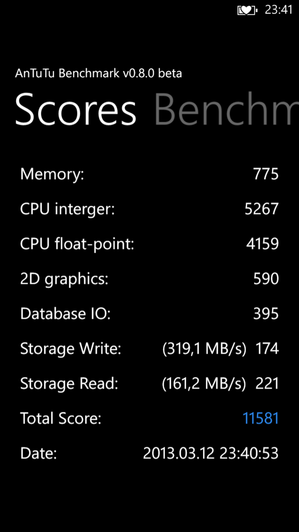 Дисплей имеет достаточный запас по яркости: картинка не блекнет в солнечную погоду. Итого: мы имеем отличный экран, лучший среди виндофонов, с небольшой оговоркой про слишком насыщенные цвета.