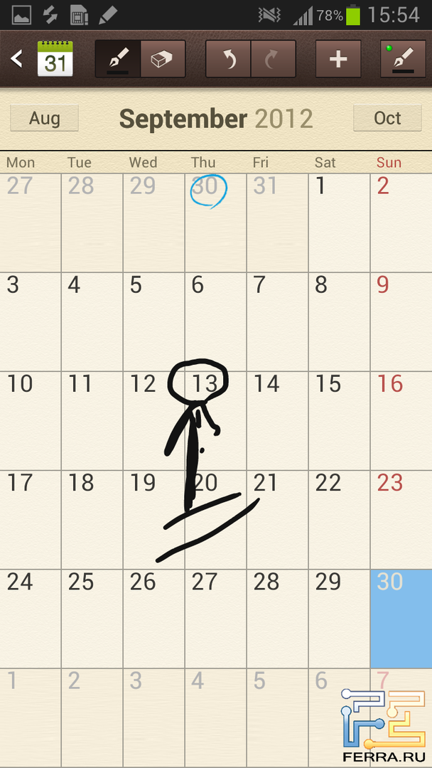 В S Planner теперь можно писать прямо поверх листа календаря, подчёркивать дни с важными событиями, добавлять любые пометки. Правда, они так и останутся лишь каракулями — распознавания знаков и стрелочек (ведь так обычно на бумажном календаре обозначают перенос встречи) в приложении нет.
