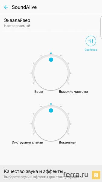 Встроенный аудиоплеер (а вы знали, что теперь он полагается только дорогим смартфонам Samsung?) поначалу кажется слишком простым, но в действительности улучшайзеров звука в нём море: помимо стандартных крутилок, регулирующих баланс высоких и низких частот и объёмный звук, имеется 7-полосный эквалайзер и набор спецэффектов.