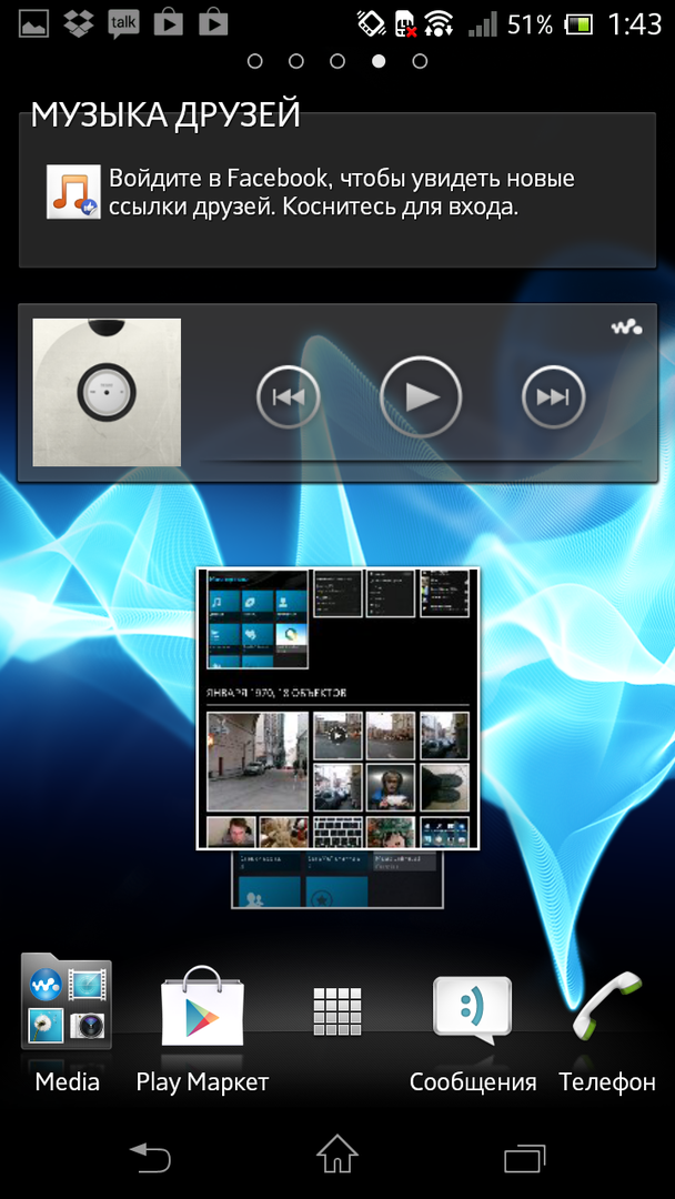 Для быстрого просмотра всех рабочих столов вместо уменьшенных копий страниц Sony предложила «режим обзора», при котором на одной странице собираются уменьшенные копии всех используемых в данный момент виджетов. Выбрав один из них, вы перейдете на ту страницу, где размещен этот виджет.