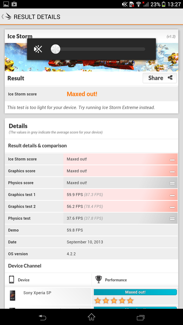 Процессор Qualcomm Snapdragon 800 с четырьмя ядрами, работающими на частоте 2.2 ГГц — грозное оружие. Даже очень грозное: по всем тестам устройства на этом процессоре (а пока это лишь Xperia Z Ultra) «делают» все на свете, а далеко позади остается даже Samsung Galaxy S4. Графическая система Adreno 330, входящая в состав этого процессора, примерно в полтора раза быстрее, чем популярная сейчас Adreno 320, а также гораздо лучше ее просчитывает физику, что важно для современных игр. Мы провели несколько тестов и в каждом из них результаты оказались очень внушительными. Мобильный 3D Mark «сообщил», что стандартные бенчмарки слишком легки для Z Ultra и предложил запустить сразу самый сложный тест.