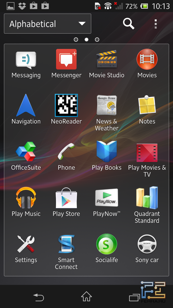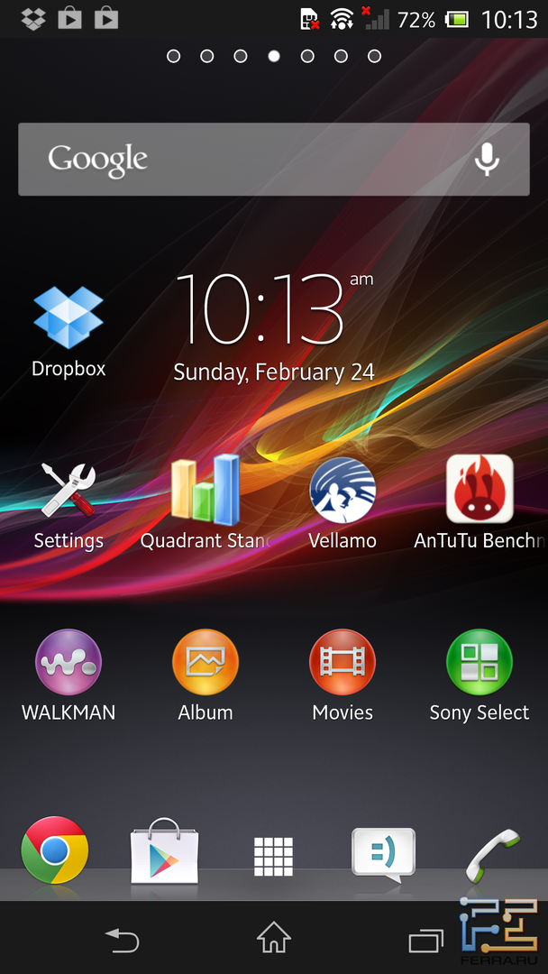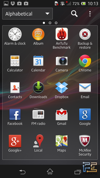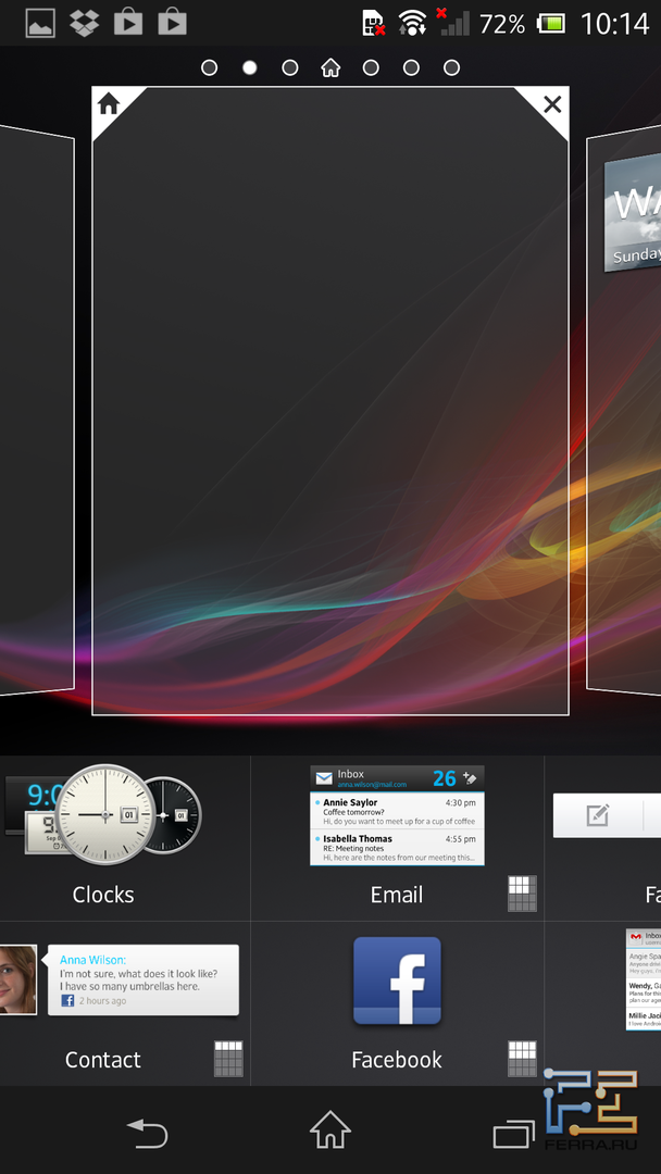 Sony, как и другие производители, постаралась модернизировать стандартные возможности Android. Рабочий стол может быть украшен одной из фирменных заставок — они очень похожи между собой, но в них безошибочно угадывается стиль Sony. Экран блокировки имеет ссылки для быстрого доступа к камере и музыкального плеера. В последнем случае не открывается приложение целиком, а лишь разворачивается строка управления аудиоплеером, экран остается в заблокированном состоянии. Рабочий стол состоит из нескольких страниц. По умолчанию их пять, однако при желании количество страниц можно изменить в пределах от одной до семи.
