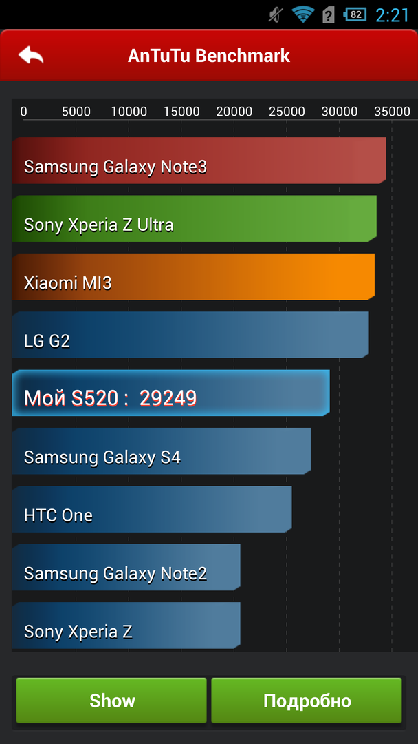 Acer Liquid S2 базируется на чипсете Qualcomm MSM8974, или просто Snapdragon 800. Ставший уже привычным атрибутом флагманских смартфонов, этот чип, тем не менее, всё ещё впечатляет своей производительностью. Не будем забывать, что совсем недавно выставки IFA и MWC демонстрировали этот SoC как самое прогрессивное графическое и процессорное решение на рынке. В современных реалиях конкурировать «в лоб» с MSM8974 может только Tegra 4, уступая в процессорных тестах и обгоняя графику Adreno 330 в графических тестах.