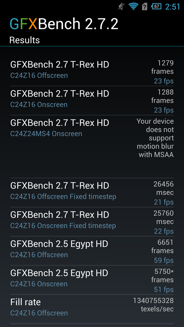 В тестах подобные особенности выразились отставанием Liquid S2 во всех процессорных проверках от конкурентов на таком же Snapdragon 800. В тесте Antutu смартфон от Acer стал практически равен HTC One на базе младшего Snapdragon 600, а отставание в Quadrant по сравнению с Galaxy Note III увеличилось до озадачивающих величин — троттлинг процессора сделал своё коварное дело. Однако в графических тестах всё оказалось куда радужнее. В 3DMark и Epic Citadel Acer уверенно обогнал всех конкурентов.