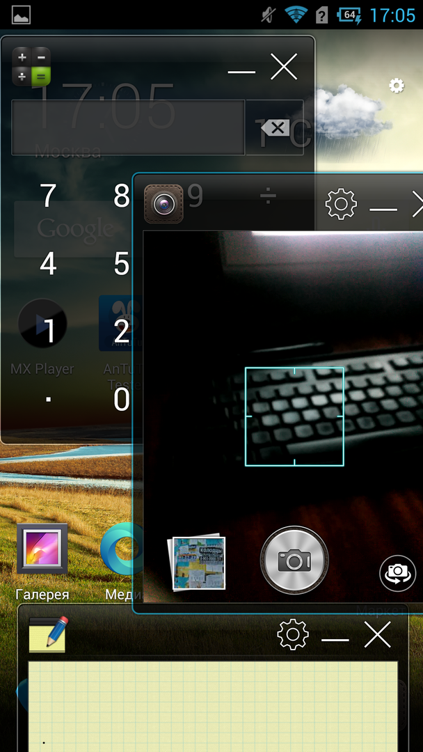 Самое непривычное и раздражающее в Liquid S2 — это отказ от привычного поведения кнопки, вызывающей настройки. Поначалу кажется, что она исчезла вовсе и теперь должна отрисовываться только на дисплее. В действительности полностью от кнопки в Acer не отказались, просто теперь она вызывается быстрым двойным тапом по клавише справа от «Дома». Основная функциональность новой безымянной клавиши — вызов списка недавно запущенных программ и ярлыков Float-приложений. Последние являются ответом Acer на внедрение «оконного интерфейса» в оболочках от Samsung и LG. В Liquid S2 вы можете запустить в фоновом окне даже фотокамеру. Правда, шесть дюймов — ещё не та площадь, на которой удобно работать с несколькими окнами, поэтому все эти гонки вооружений выглядят сомнительно.