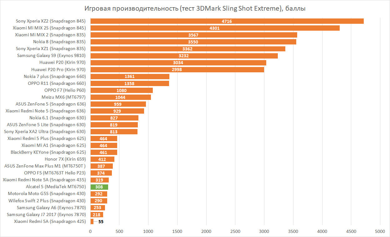 То, что Alcatel 5 основан на дохлом процессоре, становится заметно достаточно быстро. Даже закрыть приложение камеры — и то занимает такой отрезок времени, что успеваешь задуматься, а точно ли ты нажал кнопку выхода или только собирался. Виновник этого безобразия — MediaTek MT6750, пусть и восьмиядерный, но старый, горячий и очень прожорливый чип эпохи 28-нм техпроцесса (против современных 14 нм в бюджетниках и 10 нм в флагманах). Для базовых задач (переписка/видео/музыка) его хватает, а вот игры ворочаются с трудом и только нетребовательные. А вот на объём памяти жаловаться не приходится — 3 ГБ оперативной и 32 ГБ хватает практически для всего. В бюджетном смартфоне больше особо и не нужно.