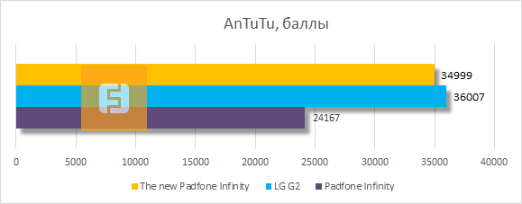 Самое главное различие между двумя поколениями Padfone Infinity — SoC, на которых они работают. В старом Infinity это был четырёхъядерный Qualcomm Snapdragon 600 (APQ8064Т) с тактовой частотой 1,7 ГГц и графическим сопроцессором Adreno 320. В новом — четырёхъядерный Qualcomm Snapdragon 800 (MSM8974) с тактовой частотой 2,2 ГГц и графическим сопроцессором Adreno 330. Новая SoC безусловно быстрее предыдущей, а чтобы понять, насколько, взглянем на результаты синтетических тестов.