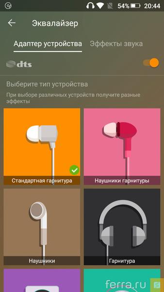 В наушниках Tasty, на удивление, неплох. Конечно, никаким выделенным ЦАП здесь и не пахнет, зато программный улучшайзер DTS Audio есть, и он, в кои-то веки, пошёл на пользу подопечному смартфону. Доступ к диспетчеру аудио возможен только через стандартный аудиоплеер, но звук программа реформирует во всей системе.