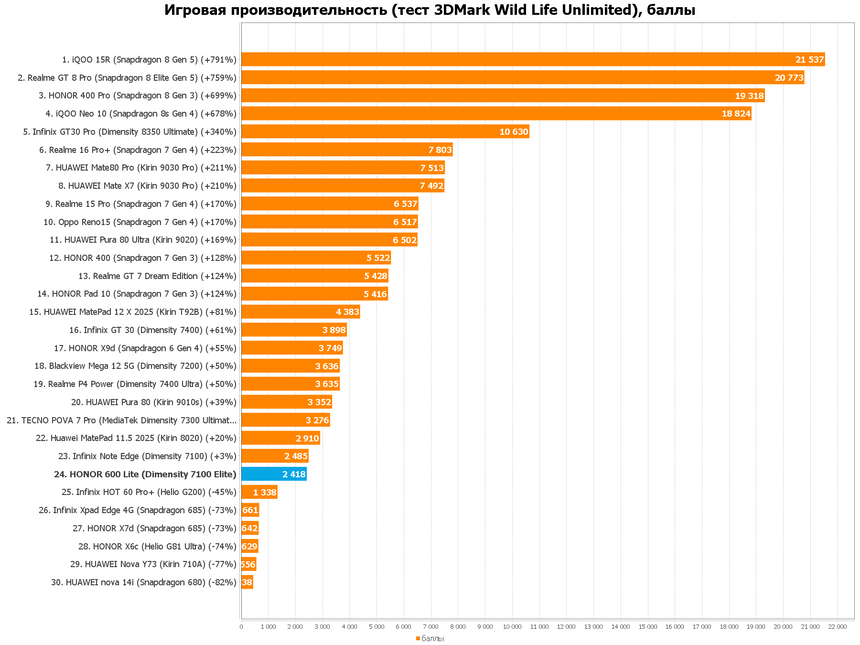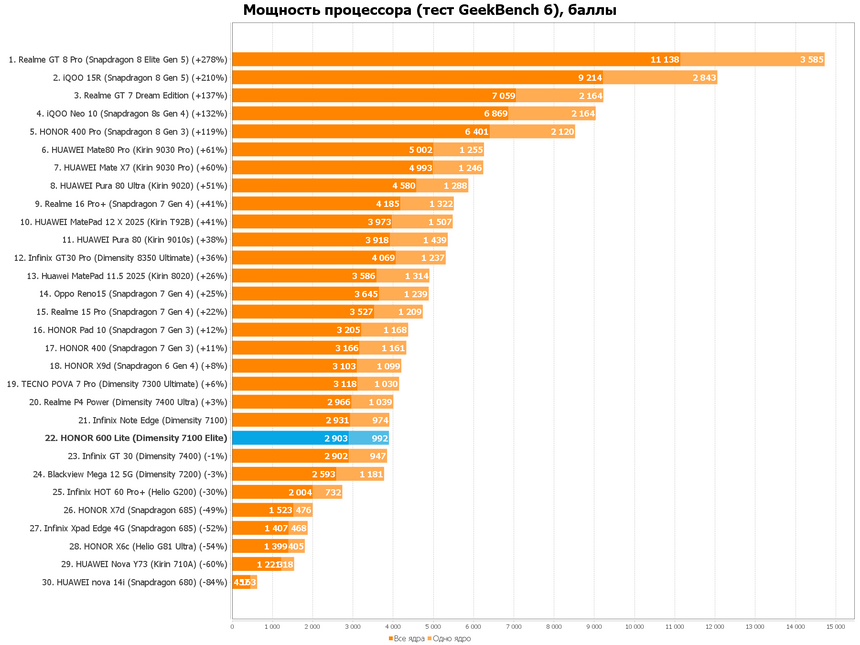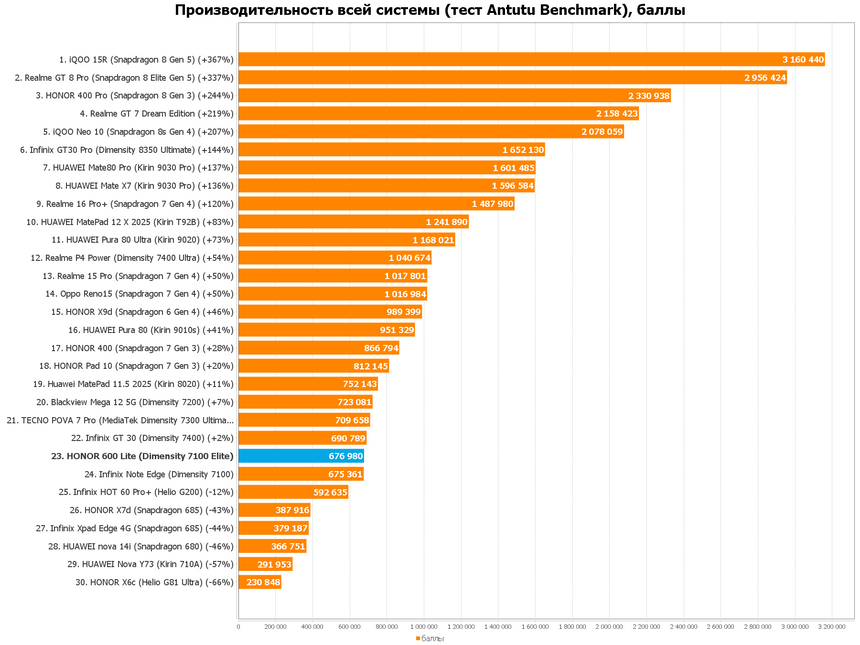 Но ладно, давайте не будем придираться к производительности, ведь сам девайс позиционируется как устройство в тонком корпусе и с хорошей автономностью. И действительно, батарея на 6520 мАч спокойно держит день-полтора в описанных нами выше сценариях использования, а сам девайс занимает позицию крепкого среднячка в нашем шорт-листе где собраны ВООБЩЕ ВСЕ устройства, побывавшие в наших тестах.