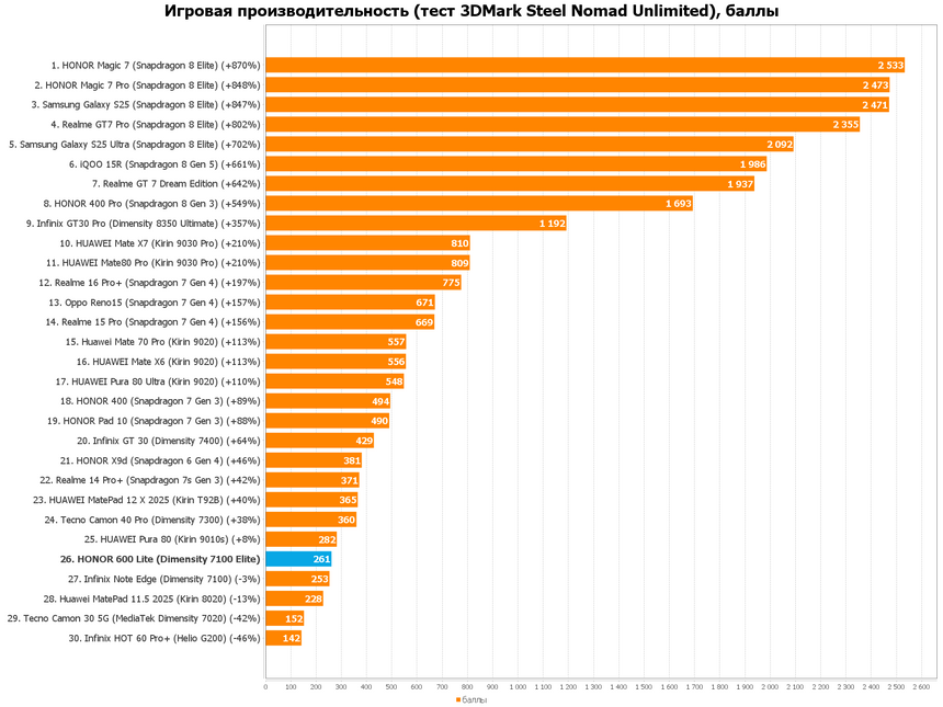 За производительностью HONOR 600 Lite отвечает чип MediaTek Dimensity 7100. Это восьмиядерный чипсет, который был анонсирован и стал устанавливаться в смартфоны только в январе этого года, а версия Elite. Процессор изготовляется по 6-нанометровому техпроцессу и имеет 8 ядер (4хCortex-A78 на 2400 МГц и 4хCortex-A55 на 2000 МГц), В повседневке его хватает с головой — мессенджеры, браузер, 10 вкладок Chrome — все летает, а ОЗУ 8 ГБ хватает на работу системы без лагов и подвисаний. А что по играм?
