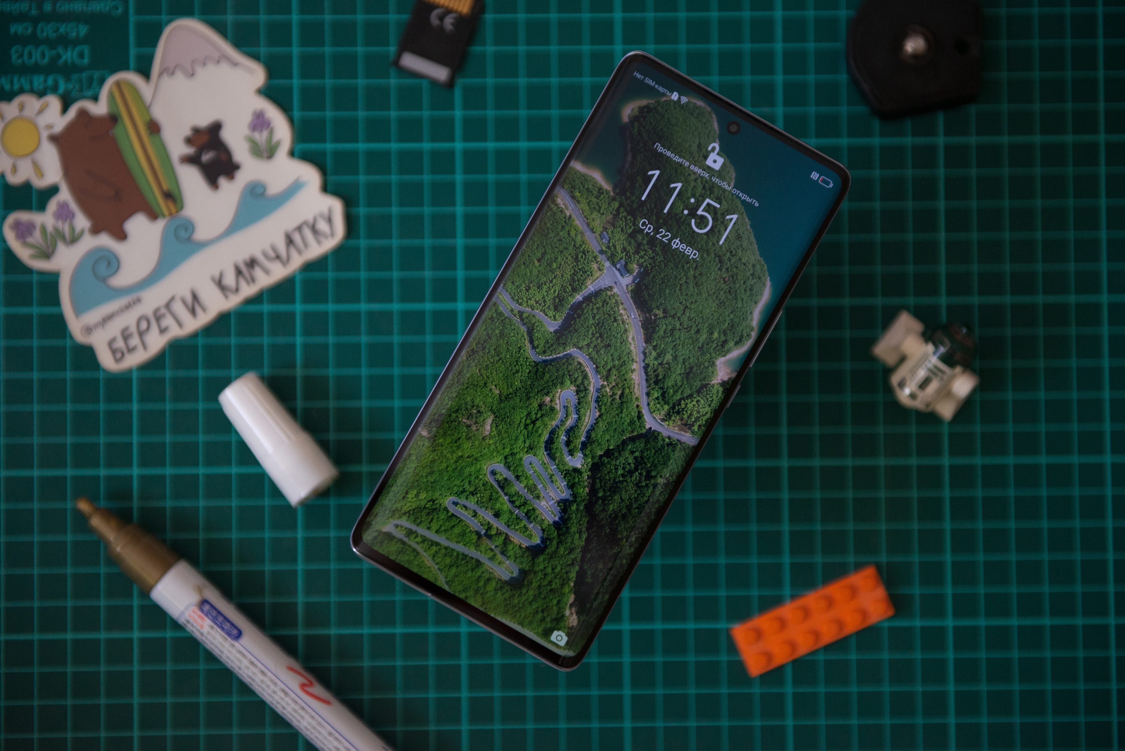 И да, дисплей немного изогнут по бокам — под углом 45 градусов. Не настолько много, чтобы изображение по краям оказывалось чуть ли не на том месте, где у обычных смартфонов раньше находилась плоская боковая рамка, но этого хватает для создания ощущения объёма. Яркость на изгибах почти не инвертируется, тени минимальны. Ложных касаний за время тестирования я не заметил.