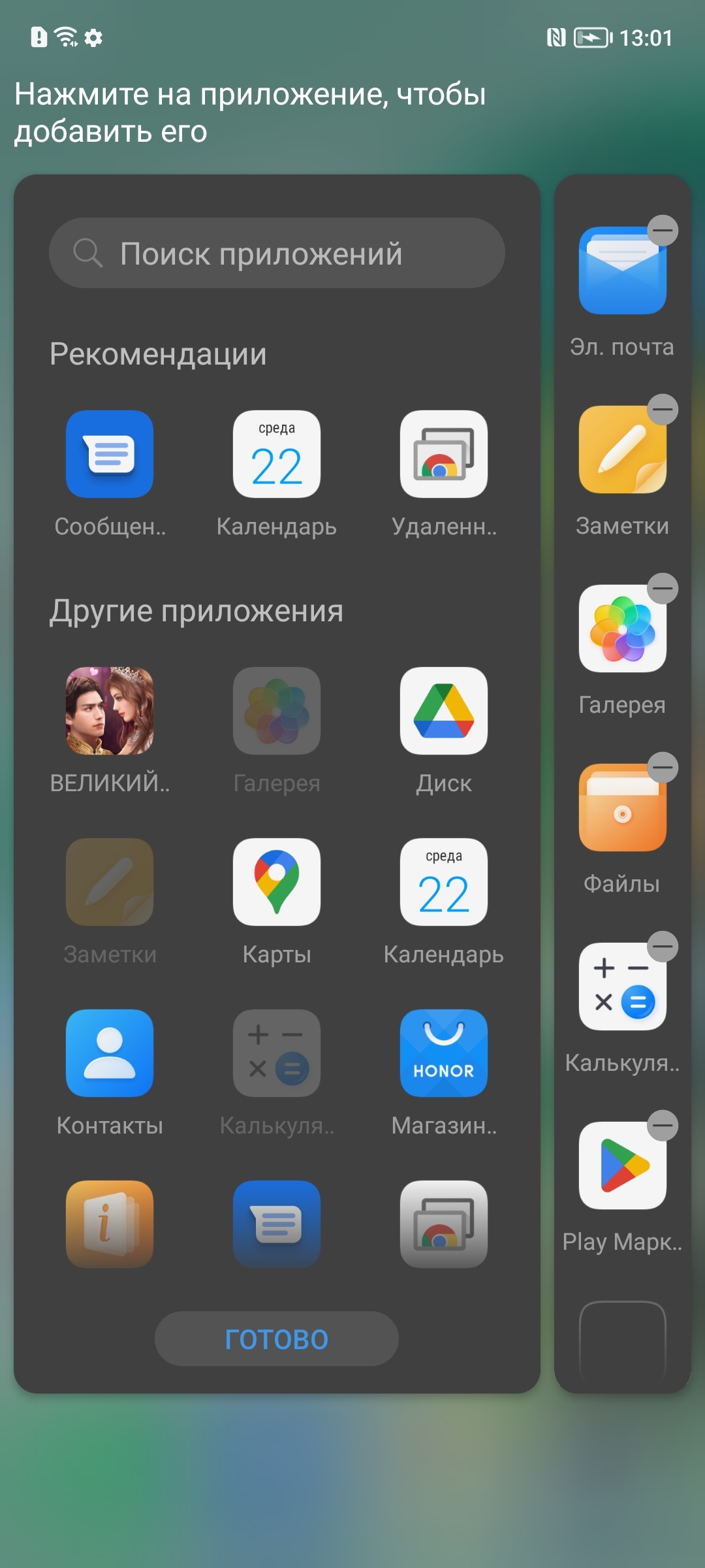 В Magic UI удобно реализован режим многозадачности. Приложения можно открывать в компактных окнах, просто «вытягивая» их из края экрана. Кроме тех приложений, что изначально добавлены в панель многозадачности, можно добавить почти любое установленное вами, будь это какая-то игра или еще один браузер.
