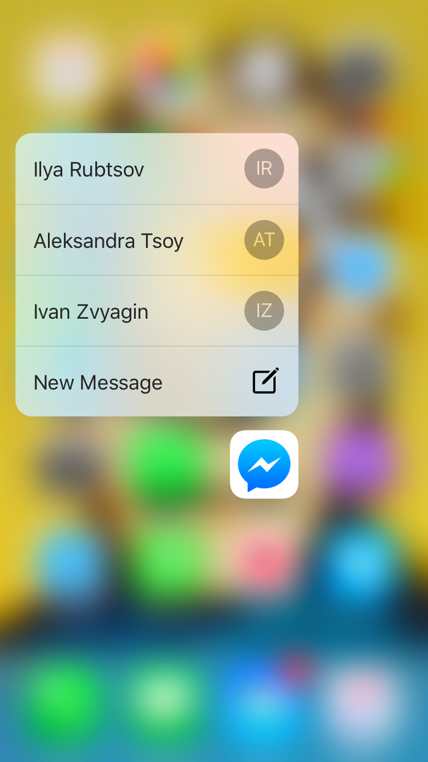 У Apple все наоборот. 3D Touch не дает телефону никаких новых возможностей (ну, скажем, у вас не получиться взвесить апельсин, положив его на экран), эта технология лишь сокращает путь который палец проходит по экрану в поисках нужной функции. Звучит как что-то незначительное, но на деле работа сильно преображается. Доступ к съемке селфи можно получить в два касания с главного экрана. Это быстрее и проще прежнего алгоритма (запустить приложение, нажать отдельную кнопку в нем). Аналогичным образом можно получить доступ к последним набранным номерам, созданию нового сообщения в SMS или мессенджерах (Telegram, WhatsApp и WeChat уже поддерживают 3D Touch, остальные еще работают на этим).