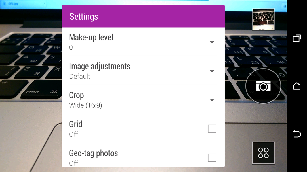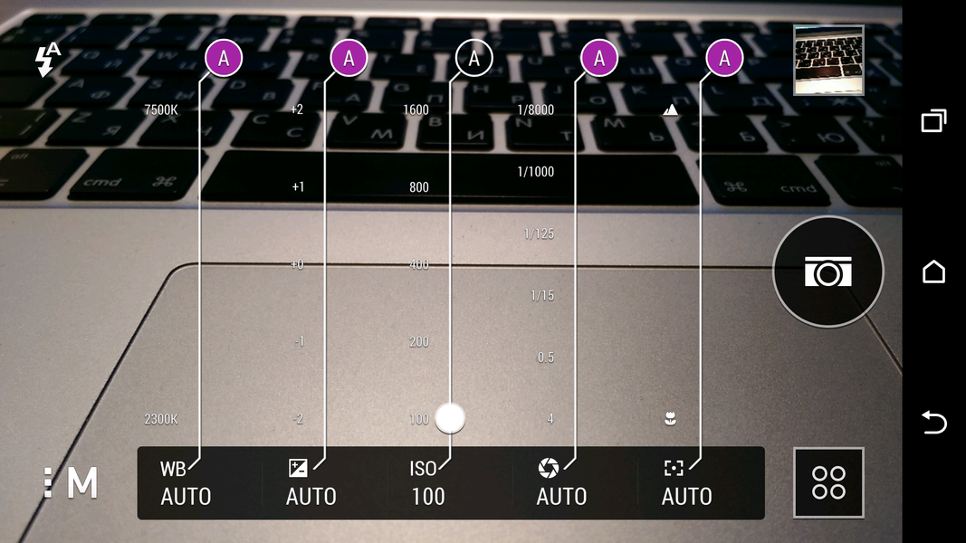 А вот интерфейс съемки можно только похвалить. HTC и раньше давала много свободы любителям вдумчивой и основательной съемки, но One (M8) задает новые стандарты. Можно вручную менять чувствительность в пределах от ISO 100 до ISO 1600, а также задавать максимум в режиме автоматического выбора чувствительности. Кроме того, можно вносить поправку экспозиции, настраивать баланс белого и даже задавать выдержку! Следующим шагом, надеемся, станет наличие привода диафрагмы, чтобы и ее можно было устанавливать вручную. Обратите внимание, как красиво выглядят экранные элементы для тонкой настройки камеры.