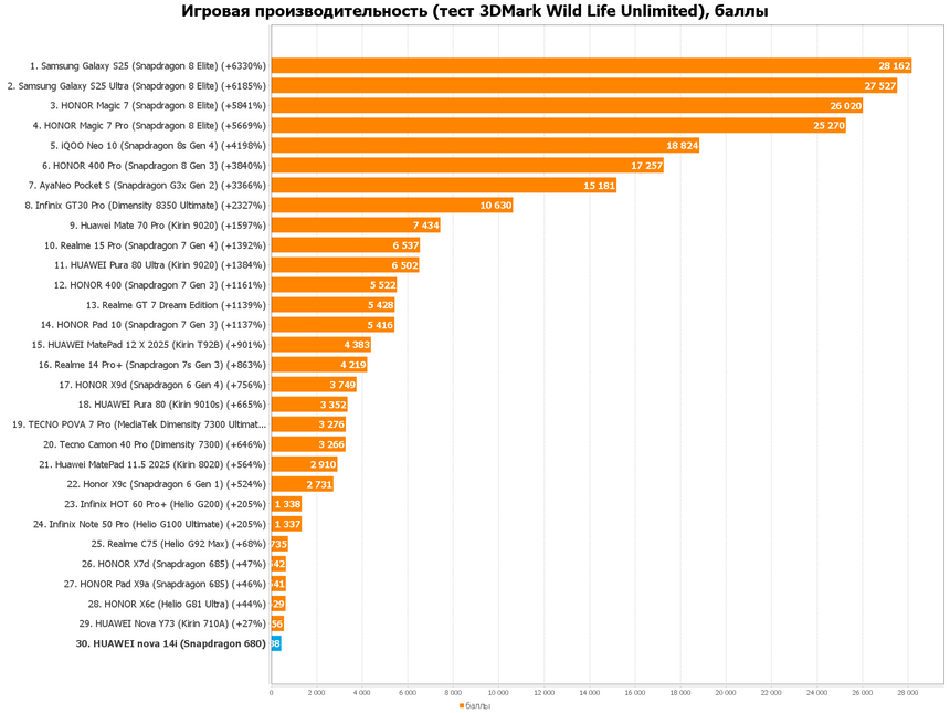 Как и у всех основных конкурентов, у HUAWEI nova 14i экран IPS, а не AMOLED, однако параметры яркости и контрастности вполне приличные (см. таблицу). Разрешение здесь Full-HD+, а максимальная частота обновления экрана составляет 90 Гц. Уже чуть меньше, чем у прямых конкурентов, но всё-таки это заметно плавнее, чем 60 Гц.