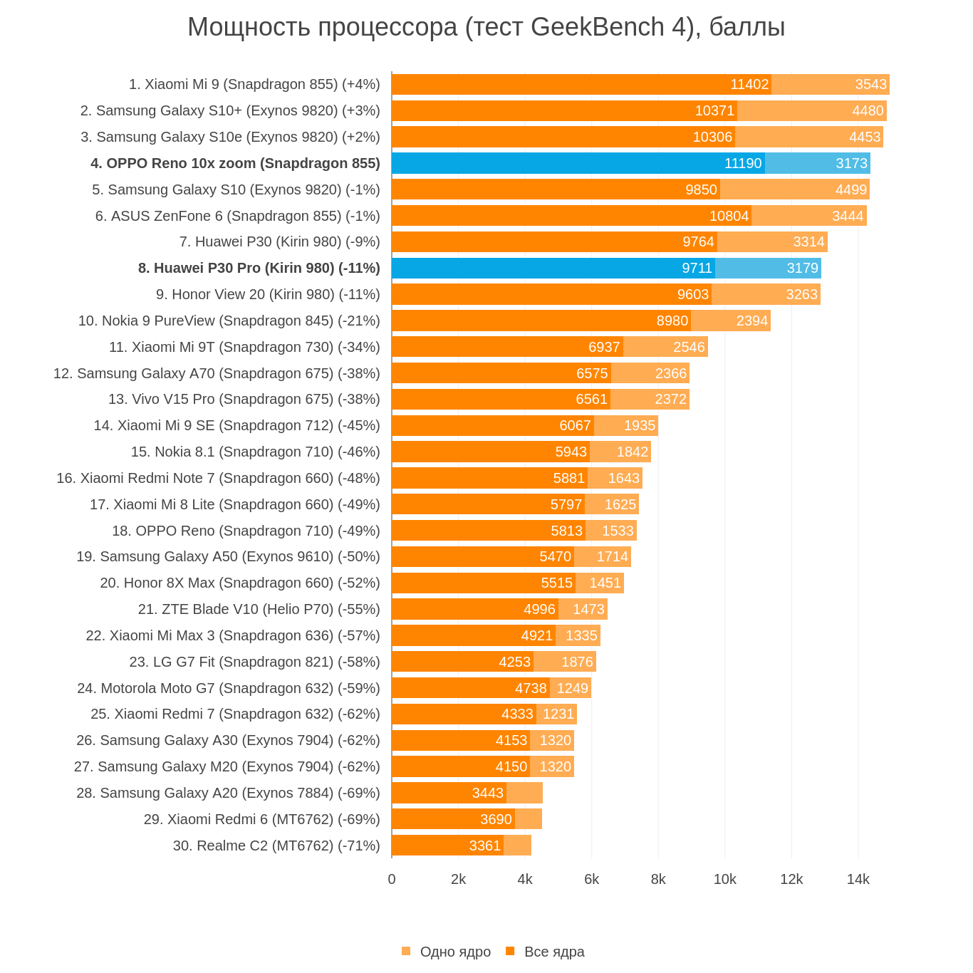 Но по нашим тестам автономности Huawei P30 Pro выигрывает. Учитывая, что аккумуляторы у них почти одной и той же ёмкости, дело, скорее всего, в большем дисплее OPPO Reno 10x zoom и большей энергоэффективности процессора в Huawei P30 Pro. Но, если говорить в абсолютных числах, то у Huawei P30 Pro автономность одна из самых высоких на рынке, а у OPPO Reno 10x zoom — просто выше средней.