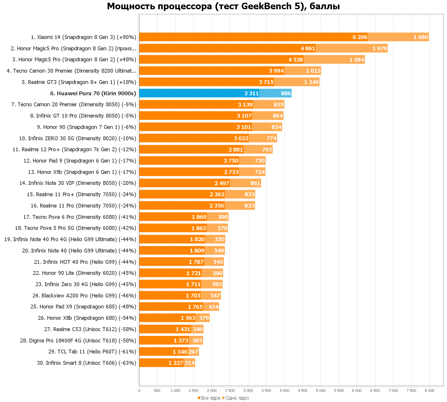 В Pura 70 используется именно он, Kirin 9000s, а не его обновленная версия под номером 9010, которую можно встретить в остальных смартфонах линейки. У s-модели чуть меньший размер кэша, чуть меньше количество инструкций за цикл, однако даже со всем этим Kirin 9000s умудряется быть быстрее того же Qualcomm Snapdragon 888.