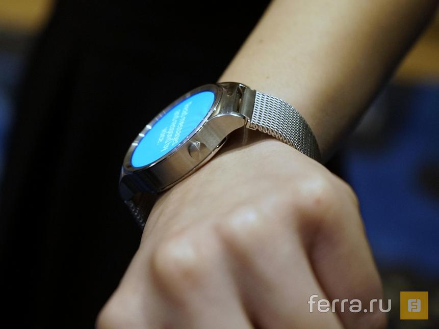 Часы выглядят солидно — отчасти за счёт толстого корпуса, однако и на женской руке Watch смотрится уместно. Круглый экран AMOLED диаметром 1,4 дюйма покрыт сапфировым стеклом, которое [в теории] не боится царапин. Гаджет построен на базе процессора Qualcomm 1,2 ГГц, оперативной памяти в нём 512 МБ, а для хранения данных предусмотрено 4 ГБ флеша. Работают часы с любым смартфоном на Android выше версии 4.3, а соединение происходит с помощью Bluetooth 4.1.