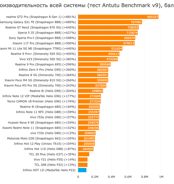 Разница в цене у HOT 12i и HOT 12 Play минимальная, буквально тысяча рублей, однако технически смартфоны очень сильно отличаются друг от друга размером экрана, количеством камер, емкостью аккумулятора, типом зарядного порта, наличием NFC… Список такой, будто речь о продуктах не из одной линейки, а про смартфоны-разноклассники. Наконец, процессоры Unicos T610 и Helio P22 тоже обеспечивают существенный разрыв в производительности между этими двумя аппаратами. HOT 12i работает на последнем, это изготовленный по техпроцессу 12 нм чип с четырьмя ядрами Cortex-A53 2.0 ГГц и графическим ускорителем PowerVR GE8320.
