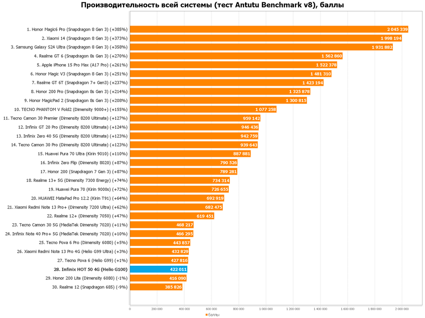 В Infinix HOT 50 4G встроен несъёмный аккумулятор на 5000 мАч. Как видите по нашим замерам, смартфон твёрдый хорошист по времени работы. С учётом того, что в нём установлен IPS, а не AMOLED-дисплей, я бы даже сказал, что отличник — вон, ниже TECNO Camon 30 с OLED и 5000 мАч и таким же по мощности процессором, у которго заряд улетает заметно быстрее.
