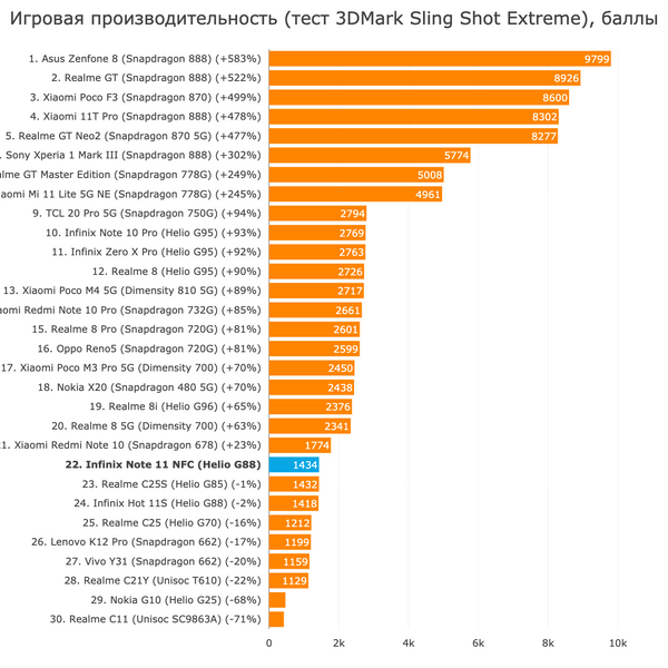 Понятное дело, что Realme 8 стал таким выгодным спустя год после выхода и ближе к концу конвейерной жизни. А у Poco M4 Pro 5G синюшный дисплей IPS и цены 22 тысячи рублей против 18 тысяч у Infinix. Но в целом-то в смартфонах с экранами похуже и 4/64 ГБ стоит такой же процессор при их (смартфонов) стоимости порядка 12-13 тысяч рублей. В Realme доплата в 5 тысяч рублей в сравнении с дешёвыми смартфонами закономерна — тут всего дофига и характеристики соответствуют, просто это далеко не самый быстрый смартфон за 17-20 тысяч, как видите в бенчмарках.