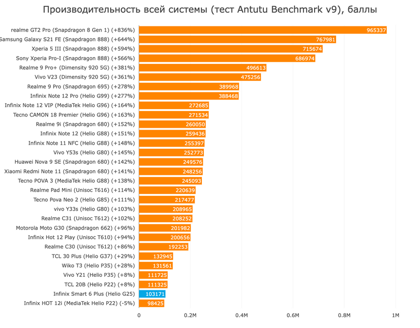 Конечно, у Realme C30 нет сканера отпечатков пальцев, тоже “задушенный” процессор (вроде такой же Unisoc T612, как и у Realme C31/C21Y, но по факту замедленный) и всё такое, но… Вы посмотрите на результаты бенчмарков выше. Это же небо и земля!