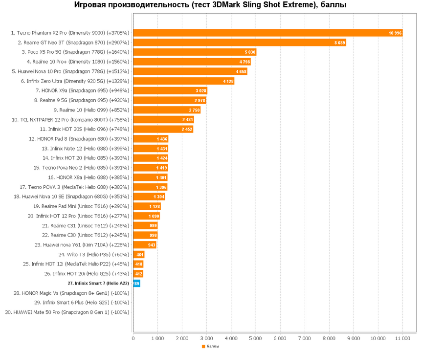Ну и, в общем, место в рейтингах производительности соответствующее. Разве что в тесте Geekbench 5 он обгоняет устройства на процессоре MediaTek Helio G25, но это не потому, что A22 так хорош, а потому что смартфоны на G25 работали медленнее, чем должны были.