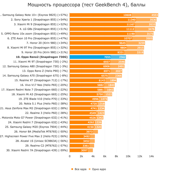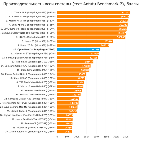 Смартфон Oppo Reno2 построен на Qualcomm Snapdragon 730G - достаточно производительном и, при этом, вполне экономичном процессоре. По части автономности смартфон Reno2 находится ближе к лучшим участникам наших тестов: