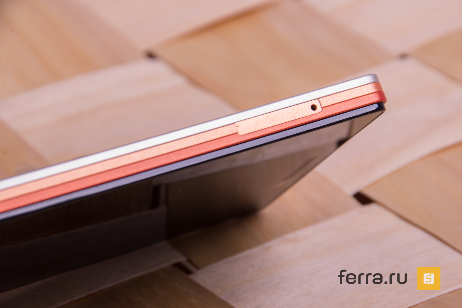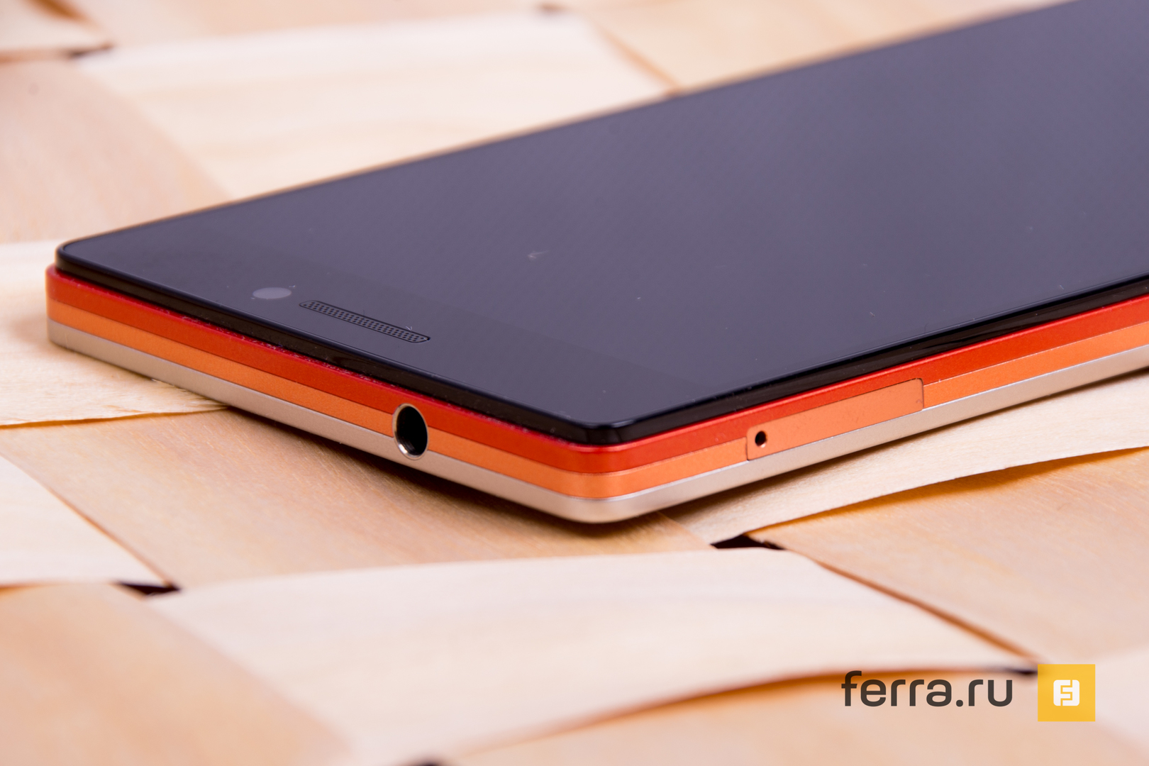 На фронтальной панели нет механических кнопок — все три функциональных клавиши сенсорные. Кнопка питания и качель регулировки громкости вынесены на правую грань, порт micro-USB — на нижнюю, а сверху оказался разъём для наушников. На левой грани расположился слот для SIM-карты, как принято в тонких смартфонах — на выезжающем по мановению скрепки лоточке.