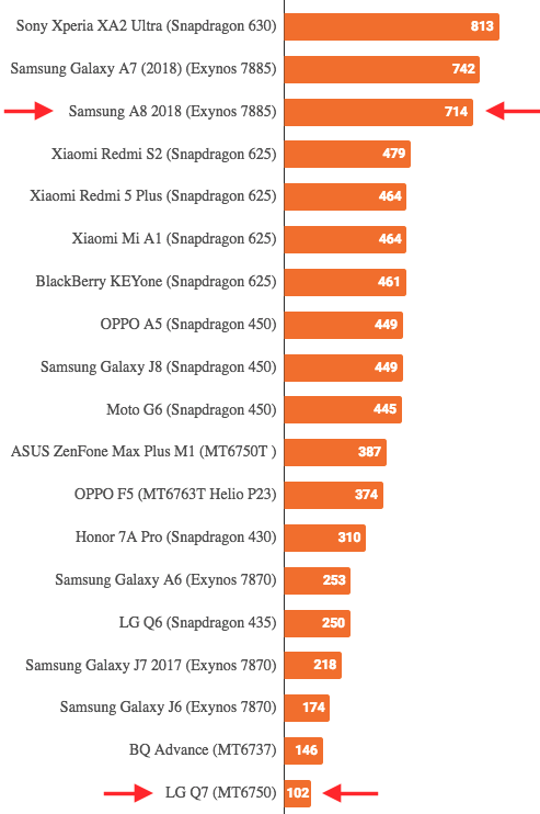 Samsung влепил в A8 процессор Exynos собственного самсунговского производства, и вот он вполне неплох — современные быстрые ядра, умеренный нагрев и энергопотребление. В итоге Samsung A8 обходит LG Q7 по всем фронтам. В том числе и по времени автономной работы.
